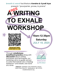 Come join us this Saturday, July 19, from 10a-1230p, at the Kathleen Clay Edwards Library, Greensboro, NC, for a free breath & word workshop, during which time co-facilitators, Kendra and Cyndi Aya, will provide participants breath work exercises that compliment writing practice.